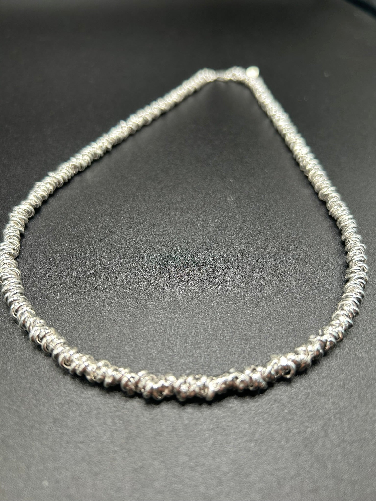 Sie besteht aus einer Reihe miteinander verflochtener Silberringe.