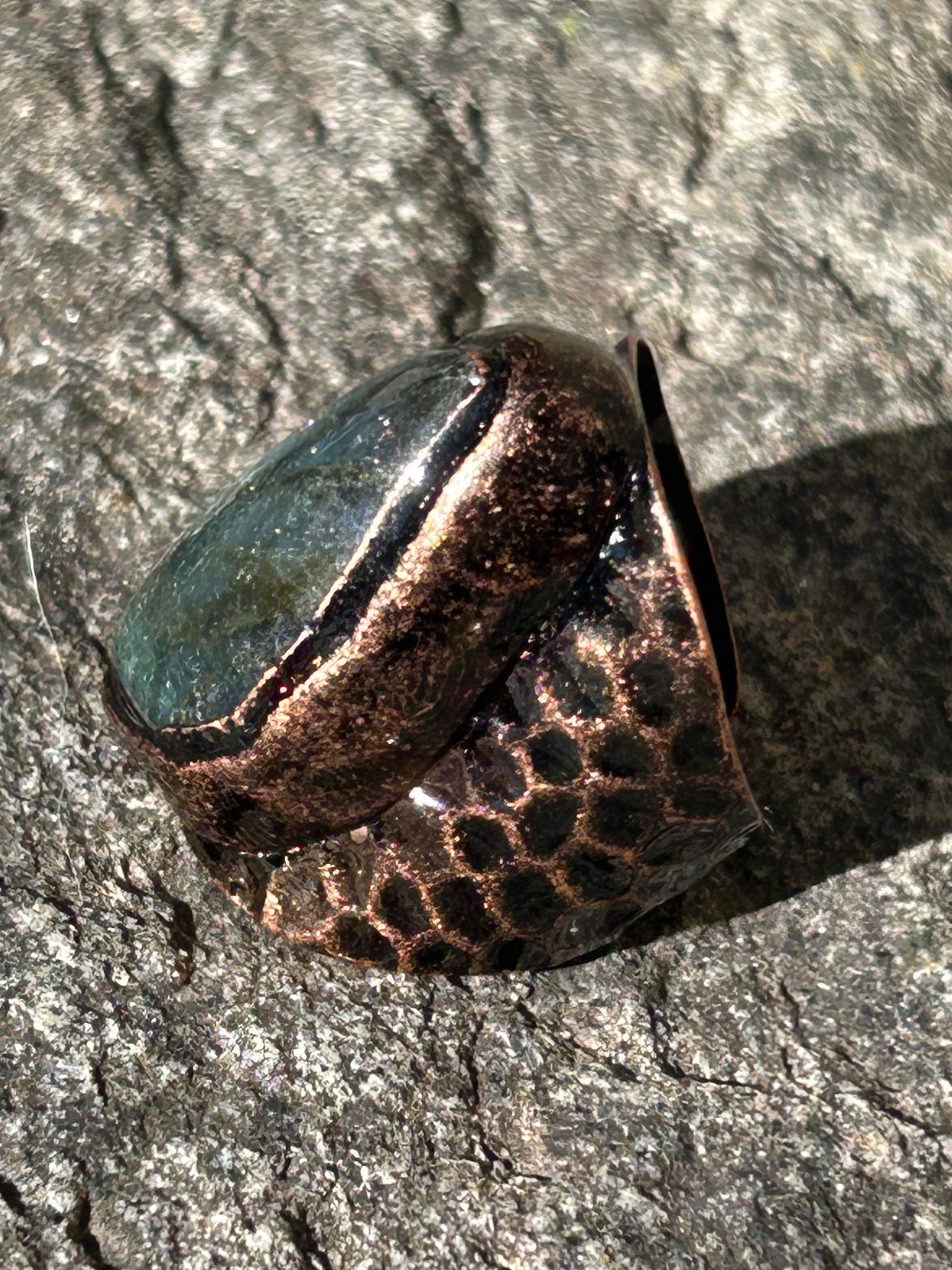 La forza del rame si unisce alla profondità mistica della labradorite, pietra di protezione e trasformazione, legata all’intuizione e alla consapevolezza interiore.