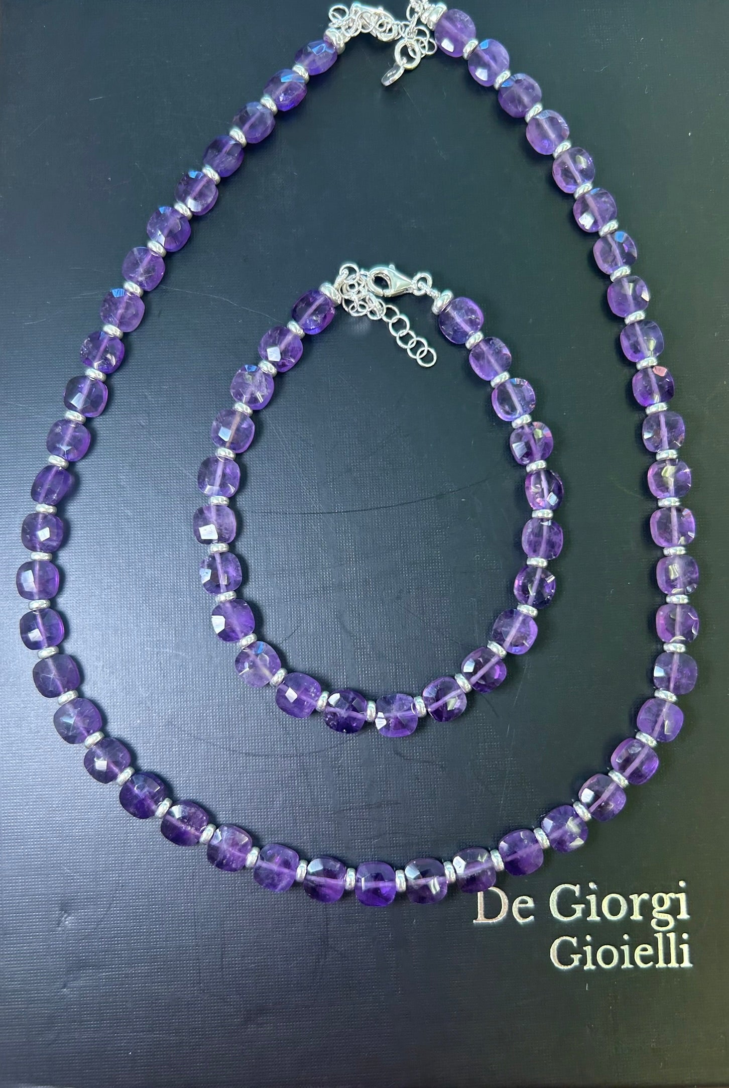 Le pietre di ametista, tagliate in geometrie quadrate, trasmettono una sensazione di equilibrio e serenità, esaltando le sfumature violacee che da sempre evocano intuizione e calma interiore. Ogni pietra è delicatamente separata da anellini in argento sterling 925, che donano ritmo e leggerezza alla composizione.