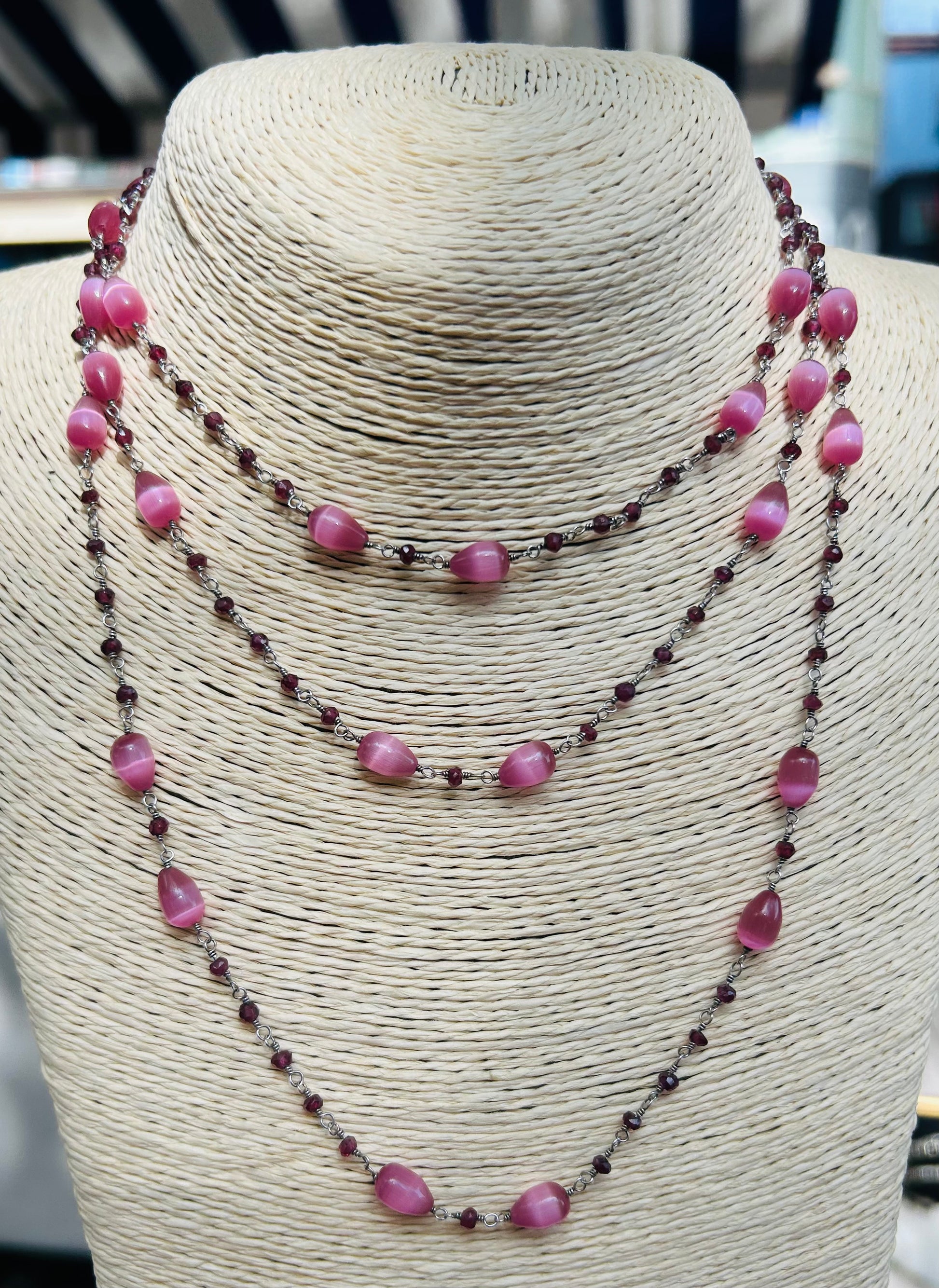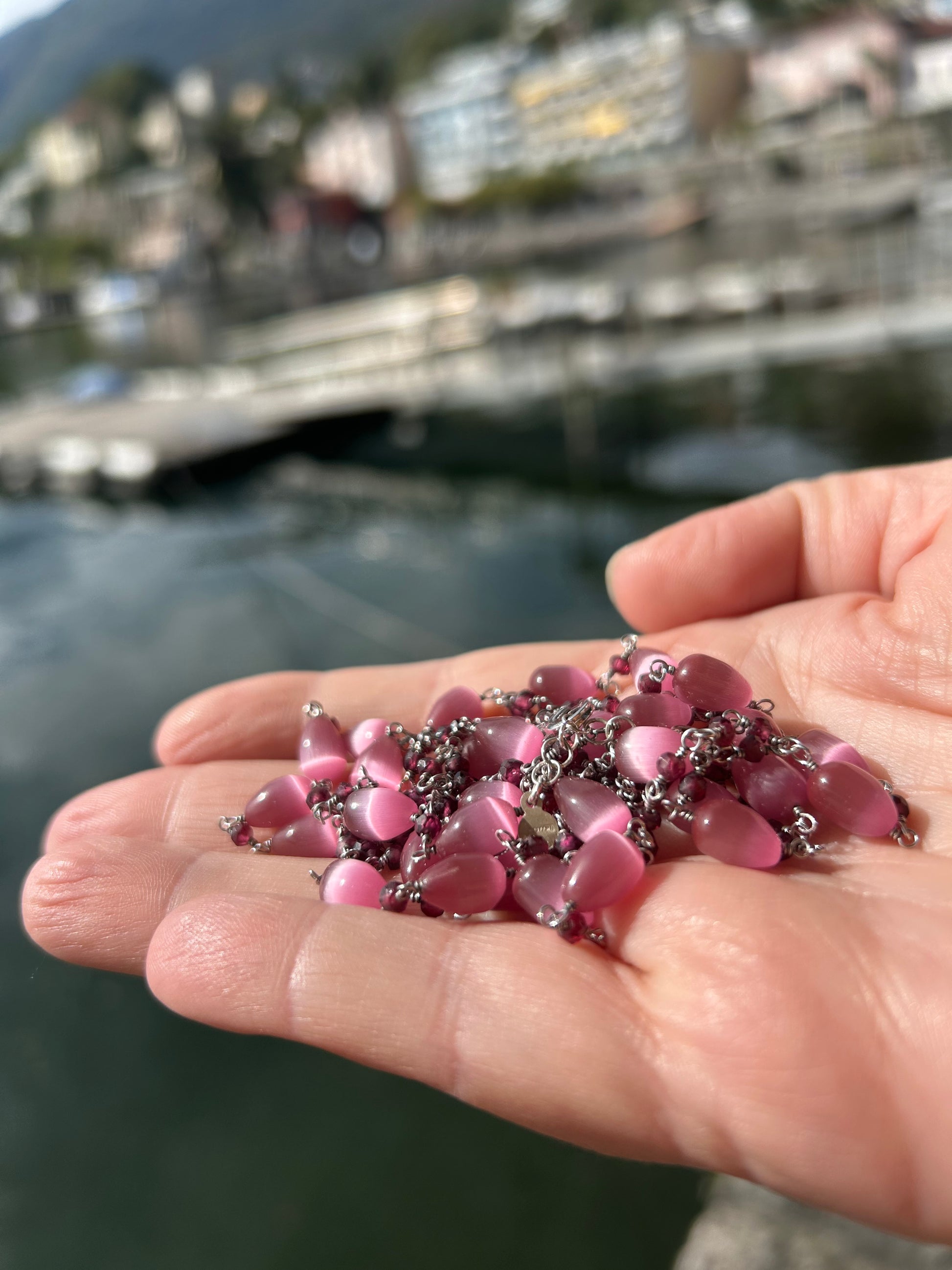 Un gioco di contrasti armoniosi prende forma in questa collana lunga e versatile. Le gocce di agata rosa, luminose e setose nelle sfumature, evocano dolcezza e vitalità. Tra di esse, piccoli granati rossi, intensi e profondi, portano un’energia calda e radicata. L’argento brunito che li unisce crea un equilibrio raffinato, dove luce e ombra dialogano in un ritmo elegante. Un gioiello che invita ad avvolgersi di colore e femminilità, da indossare in più giri per accompagnare ogni momento con grazia e eleganza.